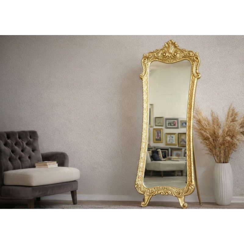 VEGA5007 Varaklı Dekor Ayaklı Boy Aynası, klasik saray zarafetini modern bir kullanım kolaylığıyla evinize taşıyor. Altın varaklı çerçeve detaylarıyla zenginleştirilen bu model, hem boy aynası hem de ikonik bir dekorasyon parçası olarak tasarlanmıştır.